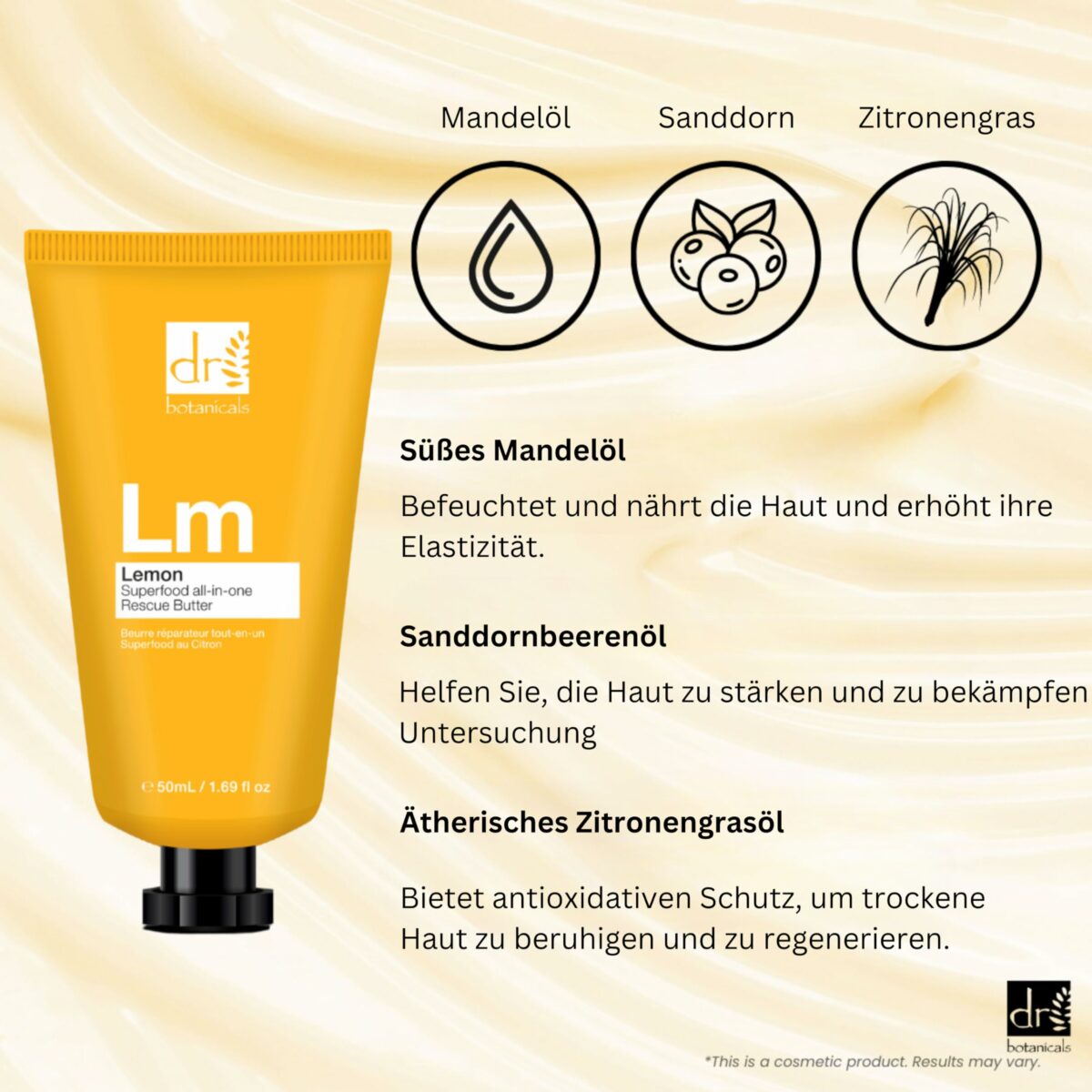 | Composition | Aqua (Water), Cetearyl Alcohol, Stearic Acid, Glycerin, Caprylic/Capric Triglyceride, Cocos Nucifera (Coconut) Oil, Helianthus Annuus (Sunflower) Seed Oil, Prunus Amygdalus Dulcis (Sweet Almond) Oil, Vitis Vinifera (Grape) Seed Oil, Phenoxyethanol, Benzyl Alcohol, Sodium Hydroxide, Hippophae Rhamnoides (Seabuckthorn) Fruit Oil, Xanthan Gum, Allantoin, Disodium EDTA, Citral, Dehydroacetic Acid, Cymbopogon Flexuosus Oil, Geraniol, Linalool, Citronellol, Eugenol, Isoeugenol, Limonene. |