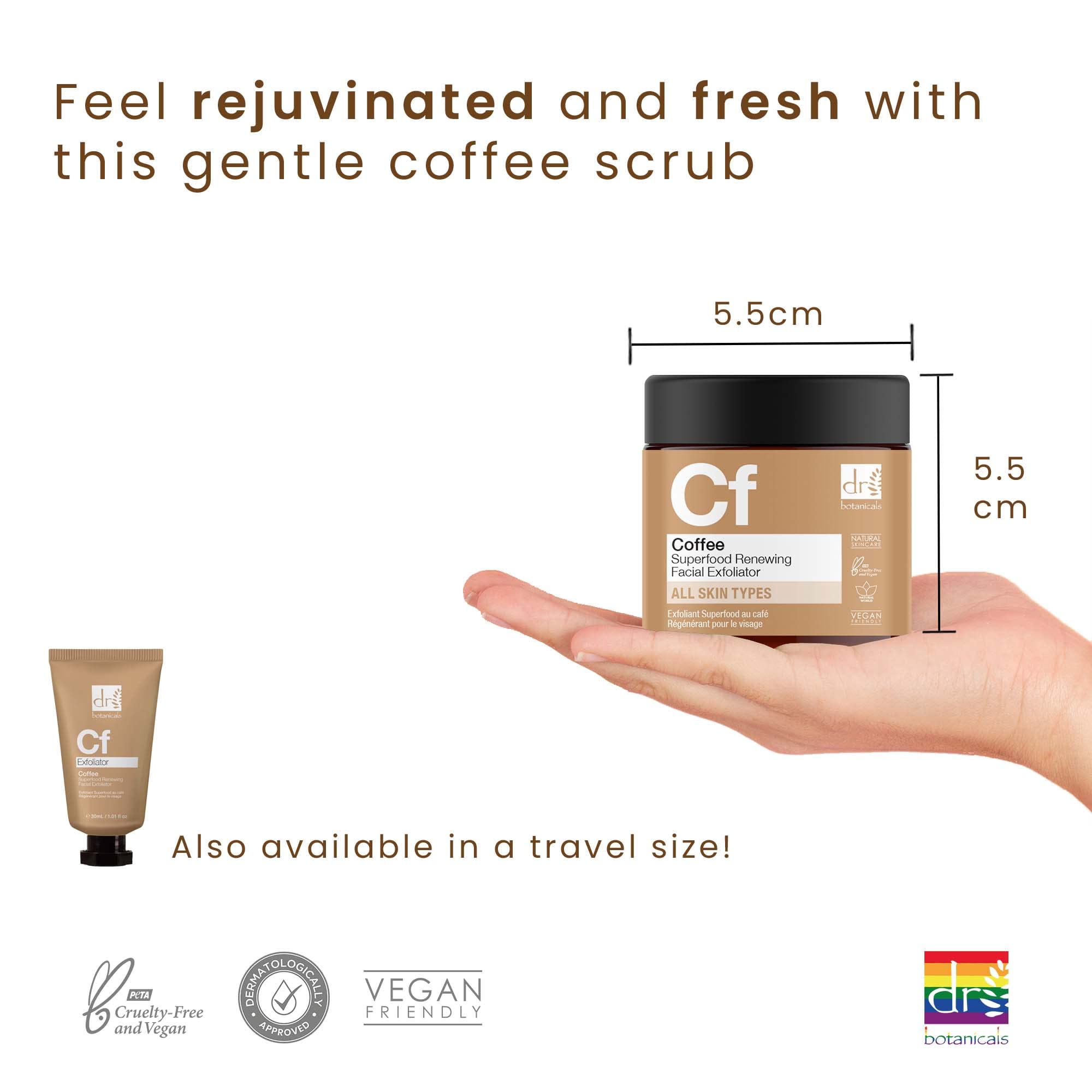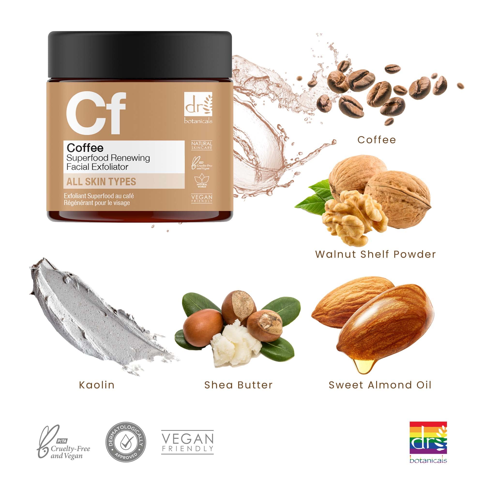 L’exfoliant régénérant pour le visage Coffee Superfood, doux mais efficace, contient un cocktail d’ingrédients anti-inflammatoires et d’extraits de fruits lissants pour la peau qui éliminent les cellules mortes de la peau pour révéler un teint doux et radieux.